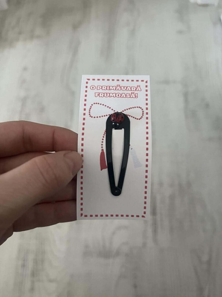 O agrafă simpatică și practică, transformată într‑un mărțișor modern și jucăuș. Tot ce ai nevoie este o agrafă metalică și o insignă sau un mic element decorativ care să aducă un strop de culoare. Prinde insigna de agrafă, atașează un șnur tradițional de mărțișor și ai obținut un accesoriu gata de purtat sau de dăruit. Cartonașele pentru ambalare sunt disponibile aici, iar tot ce rămâne de făcut este să le imprimi pe carton și să le decupezi.